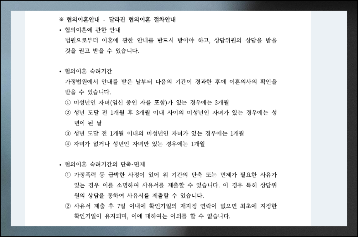 이혼서류 처리할 때는 생각할 시간을 주는 숙려기간이 있어요. 이건 다시 한 번 신중하게 결정하라는 의미예요. 아이가 있으면 기간이 더 길어집니다. 그런데 특별한 경우에는 기간을 줄이거나 없앨 수도 있어요. 이런 조건들이 양식에 다 설명되어 있으니까 꼼꼼히 읽어보세요.