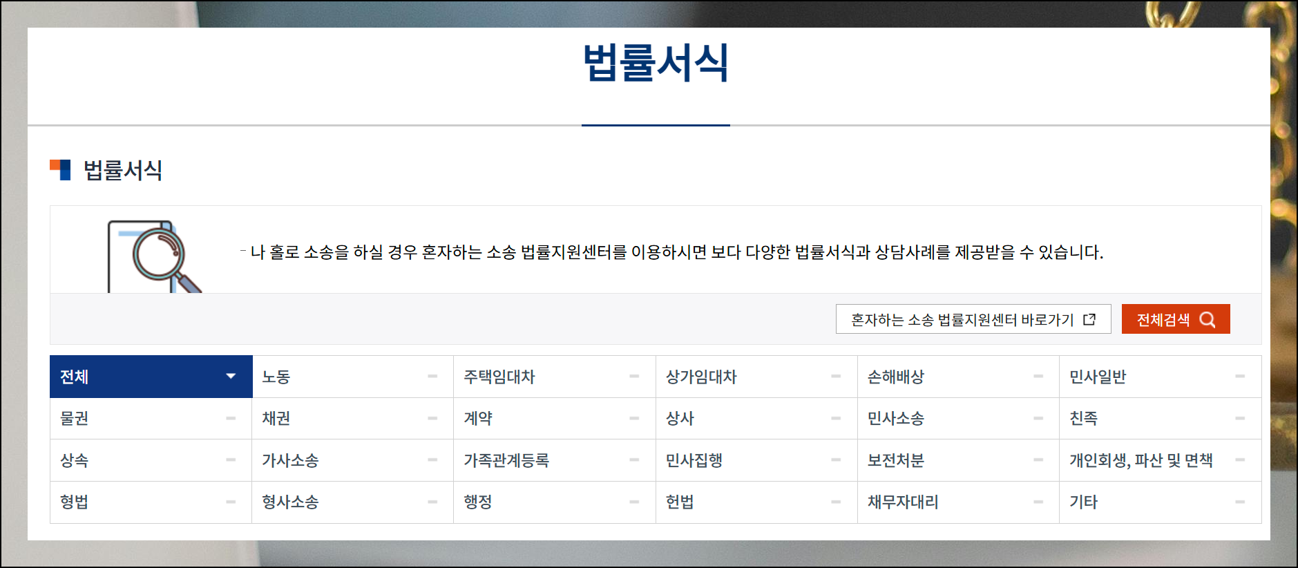 살면서 생기는 여러 법적 문제들에 필요한 문서들을 이곳에서 대부분 무료다운 받을 수 있어요. 직장에서 생기는 문제부터 돈 빌려준 일, 계약서 작성, 집이나 가게 임대 관련 업무, 유산 상속까지 정말 다양합니다. 이런 상황별로 필요한 양식들이 깔끔하게 정리되어 있으니 필요한 것을 찾아보세요.