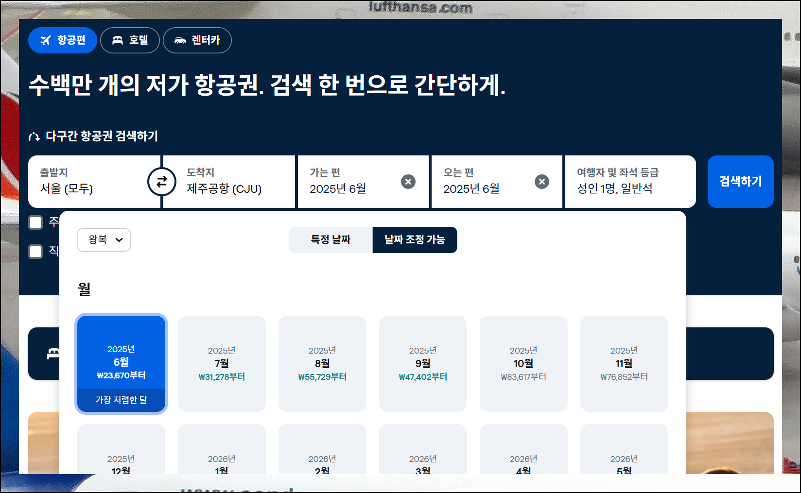 날짜 입력을 할 때에는 "날짜 조정 가능"을 선택한 상태에서 한 달 단위로 지정하는 것이 핵심이에요. 이 방법을 사용해야 싸게 나온 제주 항공권을 예약할 수 있습니다.