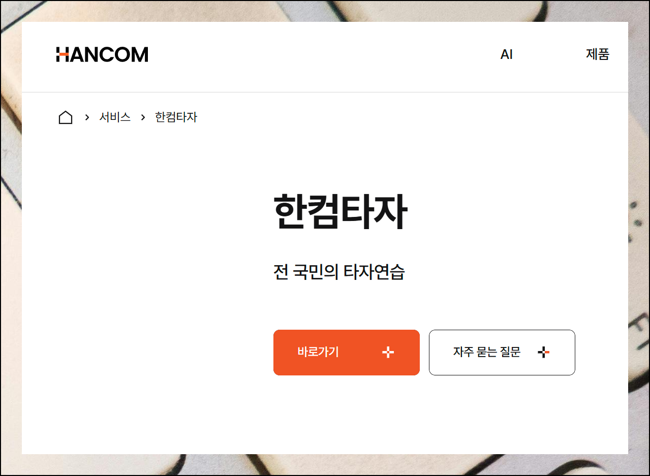 홈페이지 메인 화면에서 보면 "서비스" 메뉴가 있습니다. 여기에 마우스 커서를 올리면 "한컴타자" 메뉴가 나타납니다. 클릭해 주세요. 새롭게 열린 페이지에서는 "바로가기" 버튼을 눌러줍니다.