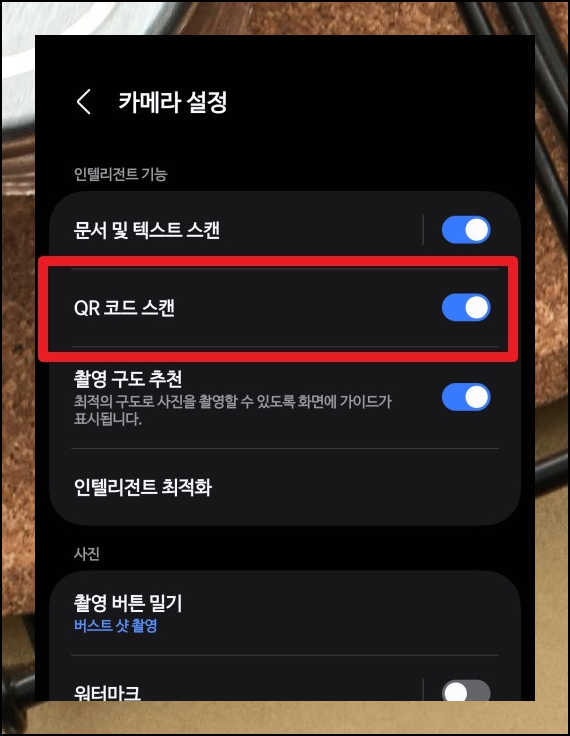 스마트폰 설정에서 카메라 설정으로 들어가 보세요. 그럼 이렇게 "qr코드 스캔"을 켜거나 끄는 기능을 찾을 수 있습니다. 이 부분을 켜지 않으면 스캔하는 기능을 사용할 수 없어요.