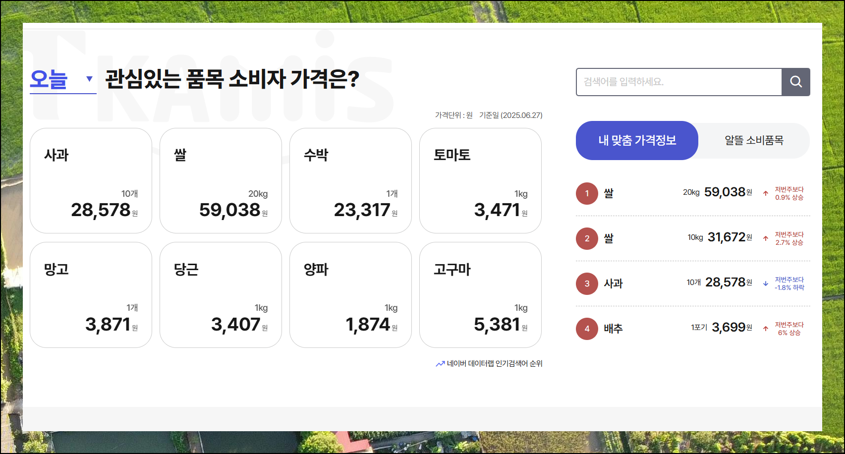 농산물 유통정보 사이트인 KAMIS도 소비자들에게 유용한 곳입니다. 공판장 시세보다는 실제 마트나 재래시장에서 거래되는 비용을 더 정확하게 보여주기 때문에 실제 장보기 전에 이 자료를 미리 파악해두면 가계 예산 관리에 실질적인 도움이 돼요.