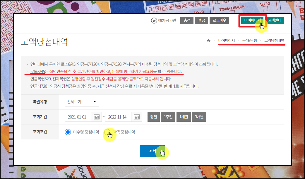 요즘에는 동행복권 사이트를 통해 복권을 구입할 수 있습니다. 이곳에서 로또를 구매했는데, 3등에 당첨이 되었을 경우, 마이페이지에 있는 [고액당첨내역] 페이지로 접속하면 됩니다. 고액당첨내역 페이지에서 실명인증을 하면 복권번호를 확인할 수 있는데요. 이 번호가 바로 당첨금을 받을 때 필요한 준비물 중 하나 입니다. 이것과 신분증을 가지고, 농협 전국지점을 방문하면 돼요.