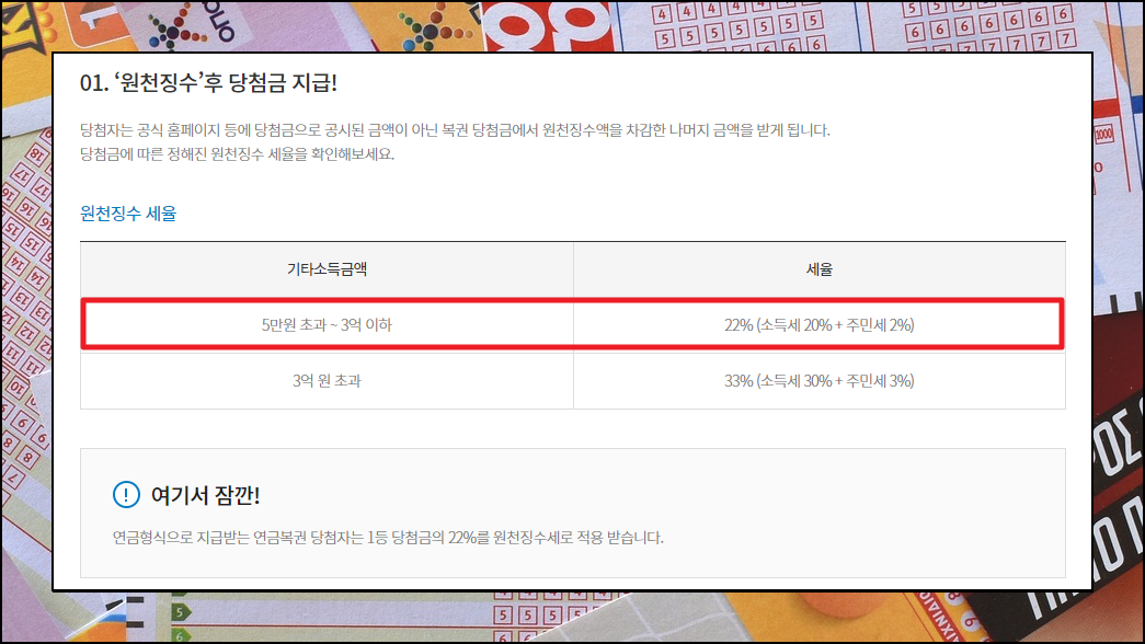 마지막으로 로또 3등 당첨금을 수령할 때 내야 하는 세금에 대해 알려드리겠습니다. 보통 3등 당첨금의 경우에는 5만원에서 3억 사이의 금액을 받게 될 텐데요. 이때 내야 하는 세금은 소득세 20%와 주민세 2% 입니다. 참고로 금액이 3억원을 초과하였다면 33%의 세금을 내야 합니다. 꽤 많이 내야 하지만, 한 번 당첨이 되어 보았으면 좋겠네요.