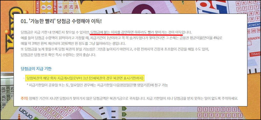 로또 3등에 당첨이 되었는데, 바빠서 NH지점 방문을 늦게 할 수 있는데요. 이때 알아두셔야 할 사항이 있습니다. 당첨금을 가능한 빨리 수령해야 이득이라는 점입니다. 늦게 받을수록 여기에 붙는 이자가 늘어나기 때문이죠. 여기에 더하여 당첨복권의 해당 회차 지급개시일로부터 1년이 지나면 받지 못하게 되는 일도 생길 수 있습니다.