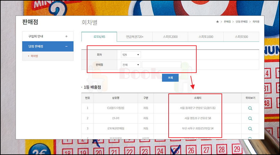 좌측에 있는 소메뉴를 보면 [당첨 판매점]이 있어요. 해당 메뉴를 클릭하면 회차별로 1등 판매점을 확인할 수 있는 페이지가 열리는데요. 가장 많이 로또 1등을 배출한 지점을 쉽게 찾을 수 있어요. 상호명은 물론이고, 주소도 나와 있으니 활용해 보세요. 위치 보기를 클릭하면 지도로도 확인이 가능해요.