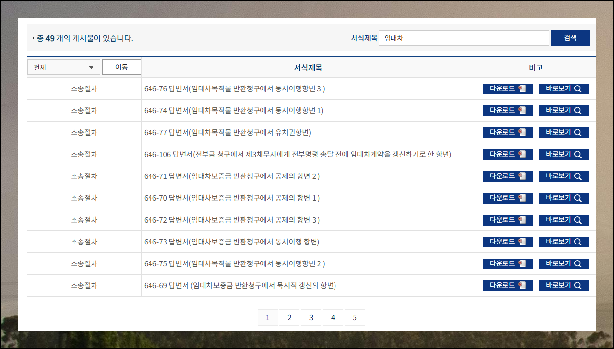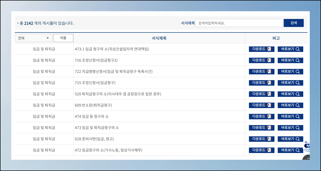 법률서식 페이지에서 화면을 아래쪽으로 내려주세요. 더 상세한 서식 정보가 준비된 전용 페이지가 바로 나타납니다. 마우스를 이용하여 스크롤을 내리기만 하면 돼요.