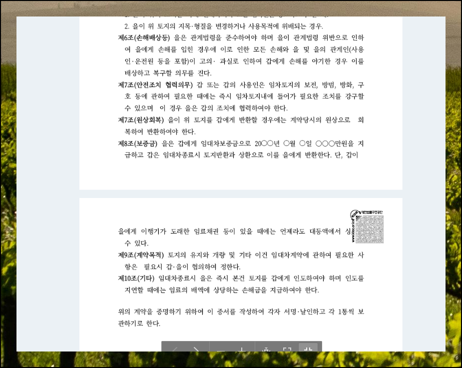 계약 섹션의 "더보기"를 누르면 여러 개의 자료를 확인할 수 있어요. 대부분이 토지 임대차 계약서 관련 서식입니다. 조경 목적인지, 주차장 사업용인지에 따라 적합한 양식이 달라요. 본인 상황에 맞는 것을 선택하는 게 중요해요.