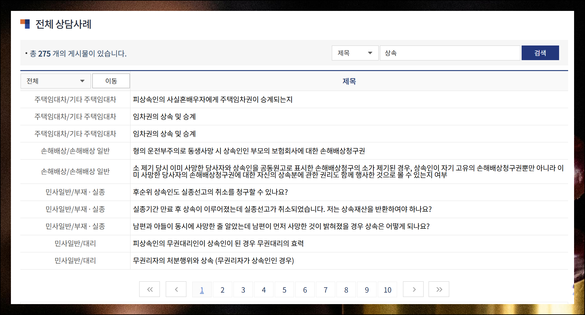 상속 관련 사례만 살펴봐도 275건이나 축적되어 있어요. 모두 최근 법률상담센터에서 실제로 처리한 생생한 사례들입니다. 제목과 내용을 꼼꼼히 살펴보면서 본인 상황과 가장 비슷한 케이스를 찾으면 됩니다.
