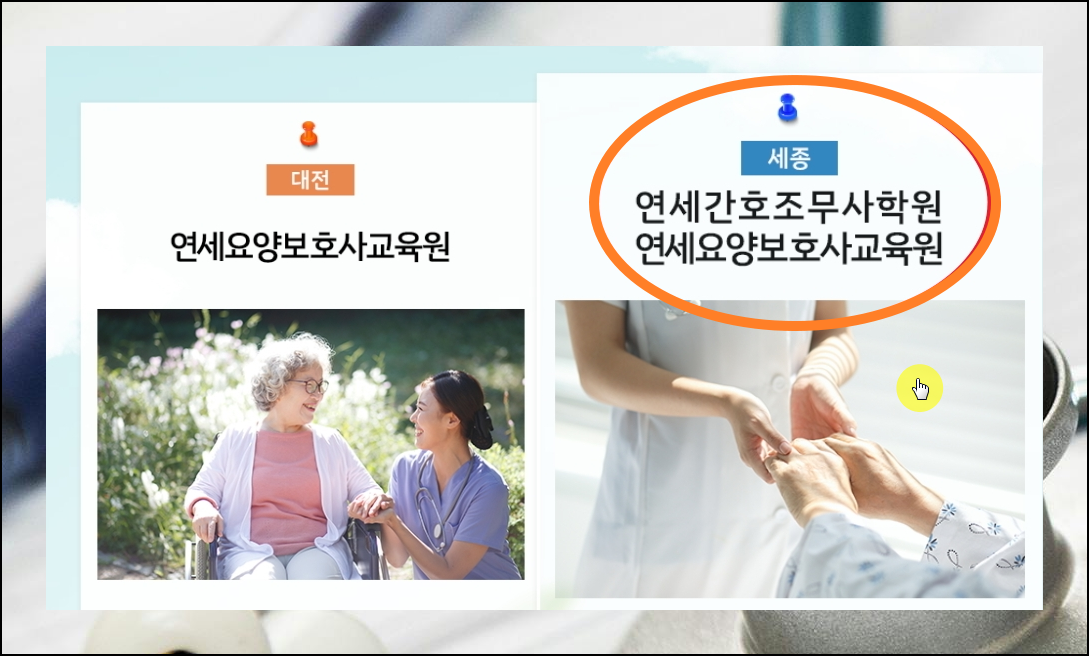 사이트 첫 화면에 접속하면 지역 선택 메뉴가 나타나요. 전국 여러 지역 중에서 세종에 있는 연세 요양보호사 교육원을 선택하면 됩니다.