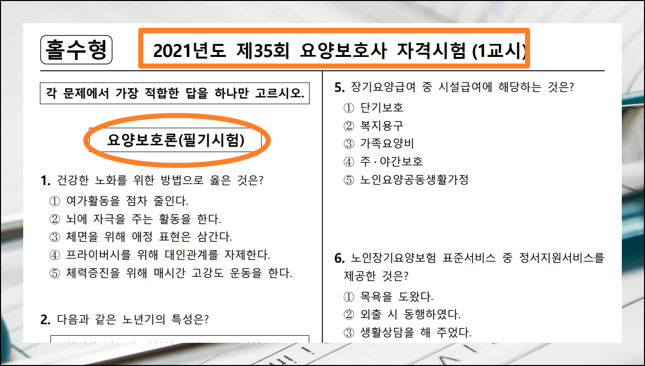 해당 자격증을 취득하려면 필기시험과 실기시험을 모두 통과해야 합니다. 필기시험에서는 요양보호론 과목을 중심으로 출제되고, 실기시험에서는 실제 요양보호 업무와 관련된 내용을 평가하죠. 오늘 소개할 무료 기출문제는 필기시험 대비용 자료로 준비했어요. 문제 형태는 5지 선다형 객관식으로 구성되어 있어서 실제 시험과 동일한 환경에서 연습할 수 있습니다.