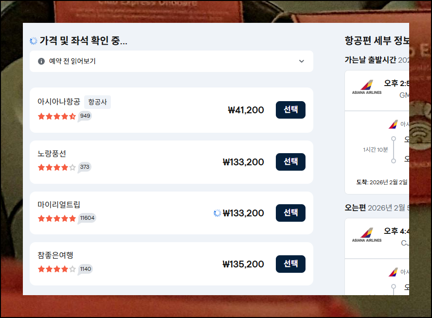 마음에 드는 저가항공권을 클릭하면 여러 예매사이트를 비교할 수 있는 페이지가 열립니다. 각 업체의 평점과 제시하는 가격을 꼼꼼히 살펴본 후 가장 신뢰할 수 있는 곳을 선택하면 돼요. 단순히 가격만 보지 말고 업체의 평판과 서비스 품질도 함께 고려하는 게 중요합니다.