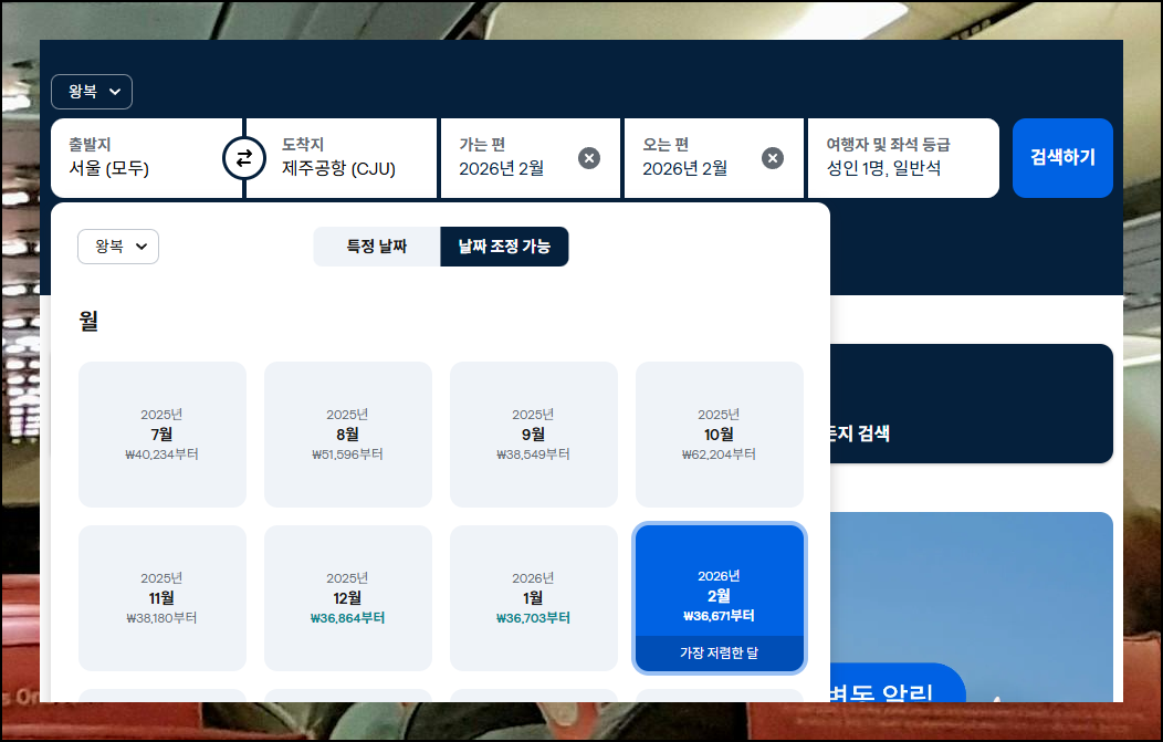 "한 달 전체" 옵션을 선택하면 달력 형태로 각 날짜별 항공료를 확인할 수 있어요. 제가 제주도 항공권을 검색할 때도 이 기능을 활용했는데, 왕복 41,726원짜리 티켓을 발견할 수 있었습니다. 날짜를 하루이틀만 조정해도 가격이 상당히 달라지니까 여러 날짜를 비교해보는 게 중요해요.