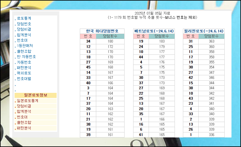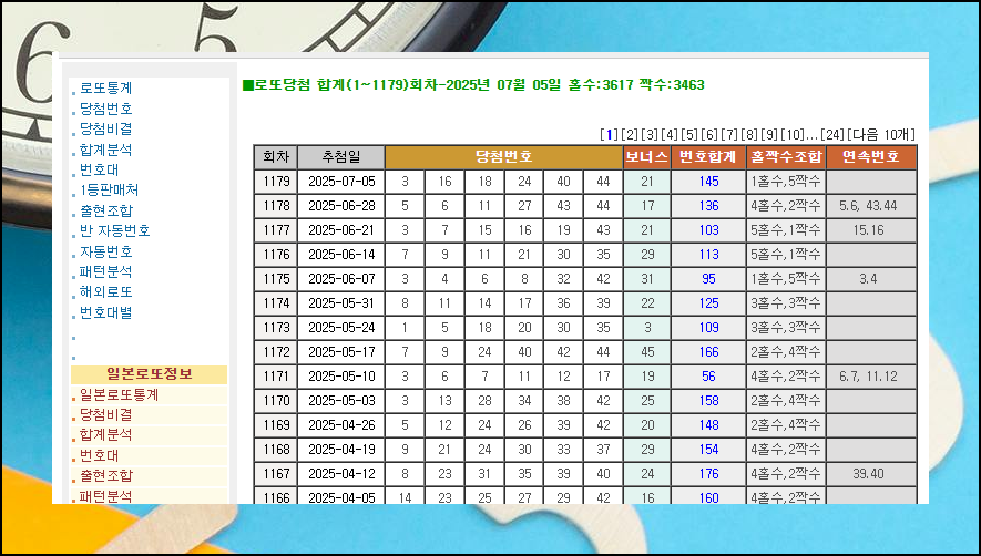 로또 게시판 페이지에는 유용한 통계 자료들이 많이 준비되어 있습니다. 왼쪽 메뉴에서 "당첨비결"을 선택해보세요. 매회 당첨번호는 물론이고 보너스 번호, 합계, 홀짝수 조합 같은 다양한 정보들을 한 번에 볼 수 있어요.
