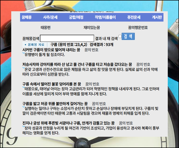 "구름"을 검색한 결과가 나타났네요. 여러 가지 꿈 내용과 해석을 살펴볼 수 있는데, 리스트에서 본인이 꾼 꿈과 비슷한 것을 찾아보세요. 우측에 있는 "꿈의 번호"를 클릭하면 됩니다.