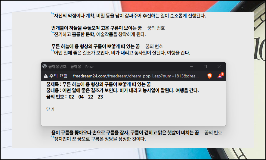 꿈 내용 하나를 클릭해보니 해당 꿈에 대한 자세한 해석과 함께 로또복권 구매할 때 사용할 번호까지 추천받을 수 있어요. 누구나 이용할 수 있는 사이트라서 접속하기만 하면 이런 정보들을 무료받기 할 수 있습니다. 꿈과 숫자의 연관성을 믿는 분들에게는 정말 유용한 서비스예요.