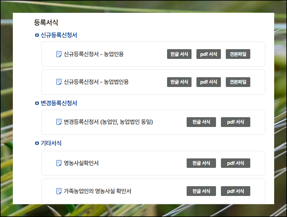 표준 서류들은 페이지 가장 하단에 위치해 있어요. 농업경영체등록 신규 및 변경 신청서, 경작사실확인서, 영농사실 확인서, 농작물다년생식물 재배지 이용사실 확인서 파일을 모두 다운받으실 수 있습니다.