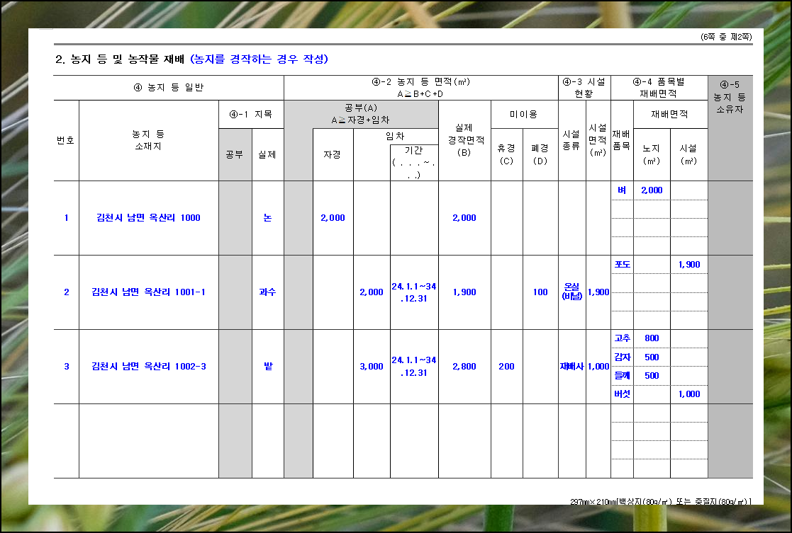 농업경영체등록 신청서 양식을 확인해보셨는데요. 구비 서류에 대한 자세한 정보는 앞서 안내한 홈페이지에서 확인하실 수 있어요. 보통 증빙자료가 필요합니다. 자경농지의 경우에는 경작사실확인서와 농자재 구매영수증 등이 필요하고, 임차농지라면 임대차계약서와 농산물 판매영수증 등을 준비해야 해요. 궁금한 점이 있으시면 관할 지원 사무소에 문의하시면 친절하게 안내받으실 수 있습니다.