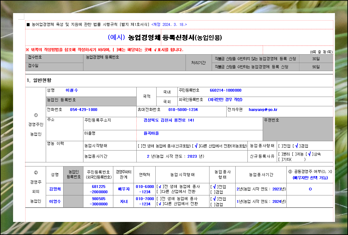 시간이 촉박한 분들을 위해 양식을 먼저 준비해드렸어요. 현재 사용 중인 서류는 2024년에 개정된 버전입니다. 신청서를 작성하고 싶을 때 꼭 사용해야 하는 양식이에요. 농업경영체 등록 서류를 꼼꼼하게 작성한 후, 관할 지원 사무소로 제출하면 됩니다. 제출 방법도 다양해요. 직접 방문하거나 우편, 팩스, 온라인 등 편한 방법을 선택하실 수 있어요.