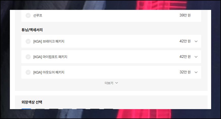 신차에 들어갈 옵션의 종류는 생각보다 정말 다양해요. 기아자동차의 드라이브 와이즈와 컴포트 기능이 대표적입니다. 헤드업 디스플레이나 하이패스 시스템 같은 편의 장치들도 있어요. 기아자동차를 처음 접하는 분들은 옵션명만으로는 기능을 파악하기 어려울 겁니다. 이럴 때에는 옆에 있는 버튼을 눌러 추가 정보 확인이 가능해요.