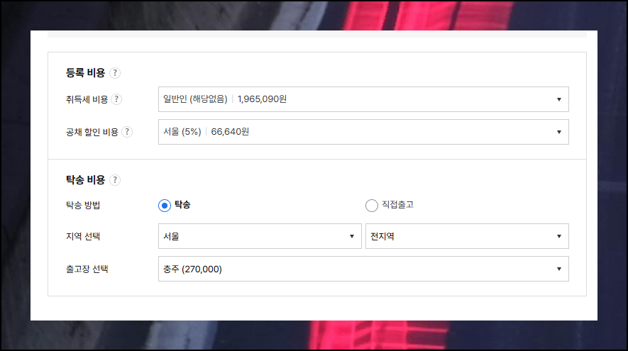 마지막으로 판매조건과 취득세, 공채, 탁송료를 선택해주세요. 화면 우측 견적서에서 모든 비용 내역을 자세히 확인할 수 있어요. 취득세와 공채 비용, 각종 부대 비용이 포함된 총 구매 금액이 나타납니다. 차량 자체 가격 외에도 추가 비용이 발생한다는 점을 반드시 고려해야 해요.