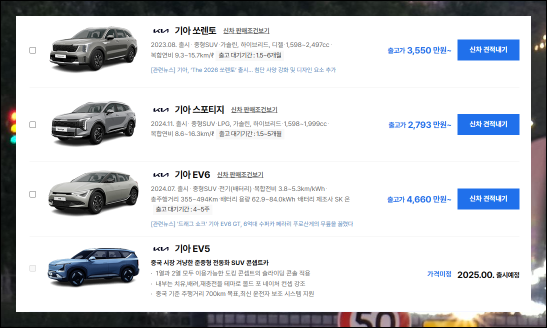 SUV가 현재 자동차 업계의 메인 트렌드라는 걸 아시나요. 기아자동차에서는 쏘렌토와 스포티지가 특히 높은 인기를 얻고 있어요. EV3와 셀토스도 소비자들의 큰 관심을 받고 있습니다. 화면에 나타난 가격이 범위로 표시되어 있어도 걱정하지 마세요.