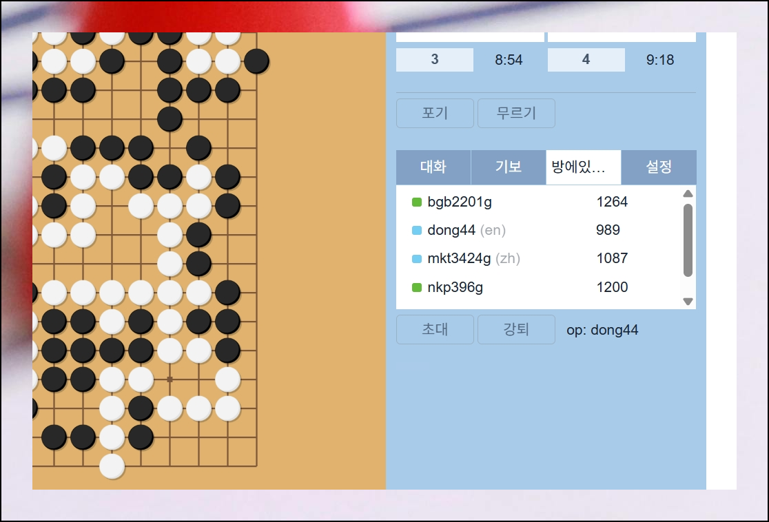 대국방에 입장하면 즉시 게임을 시작할 수 있습니다. 화면 오른쪽에는 채팅창, 기보 보기, 각종 설정 등 유용한 메뉴들이 배치되어 있어요. 상대와 이야기를 주고받으며 친분을 쌓을 수 있고, 무료로 제공되는 기보 분석 기능을 활용해서 바둑 솜씨를 늘려갈 수 있습니다.