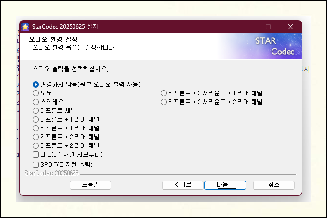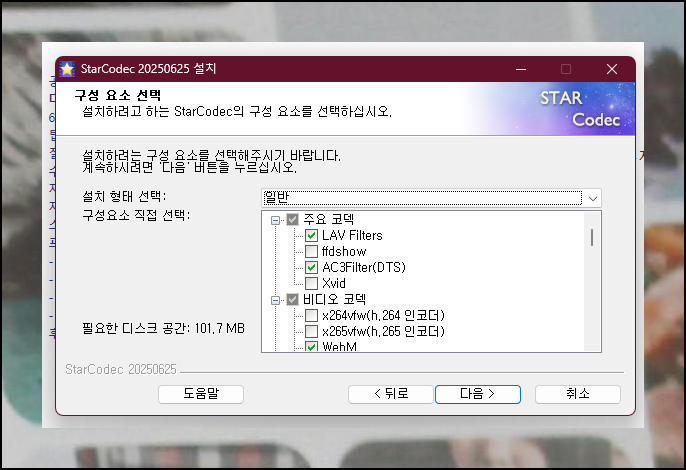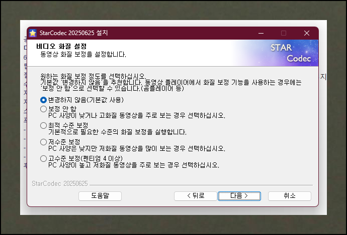 컴퓨터 환경에 맞는 설치 형태를 선택했다면 다음은 오디오 환경 설정 단계예요. 이어서 비디오 화질 설정도 진행해야 하는데요. 복잡한 설정이 부담스럽다면 기본값을 그대로 사용하는 것이 안전합니다. 곰플레이어에는 화질 보정 기능이 있지만, 통합코덱 설치 과정에서는 "보정 안함"으로 설정하는 것을 추천해요.